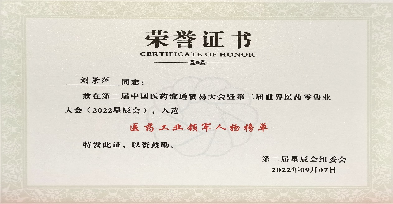 本次星辰会期间,z6尊龙斩获颇丰,获得多项行业奖项及荣誉。在开幕式上,刘景萍董事长荣获“医药工业领军人物”称号。